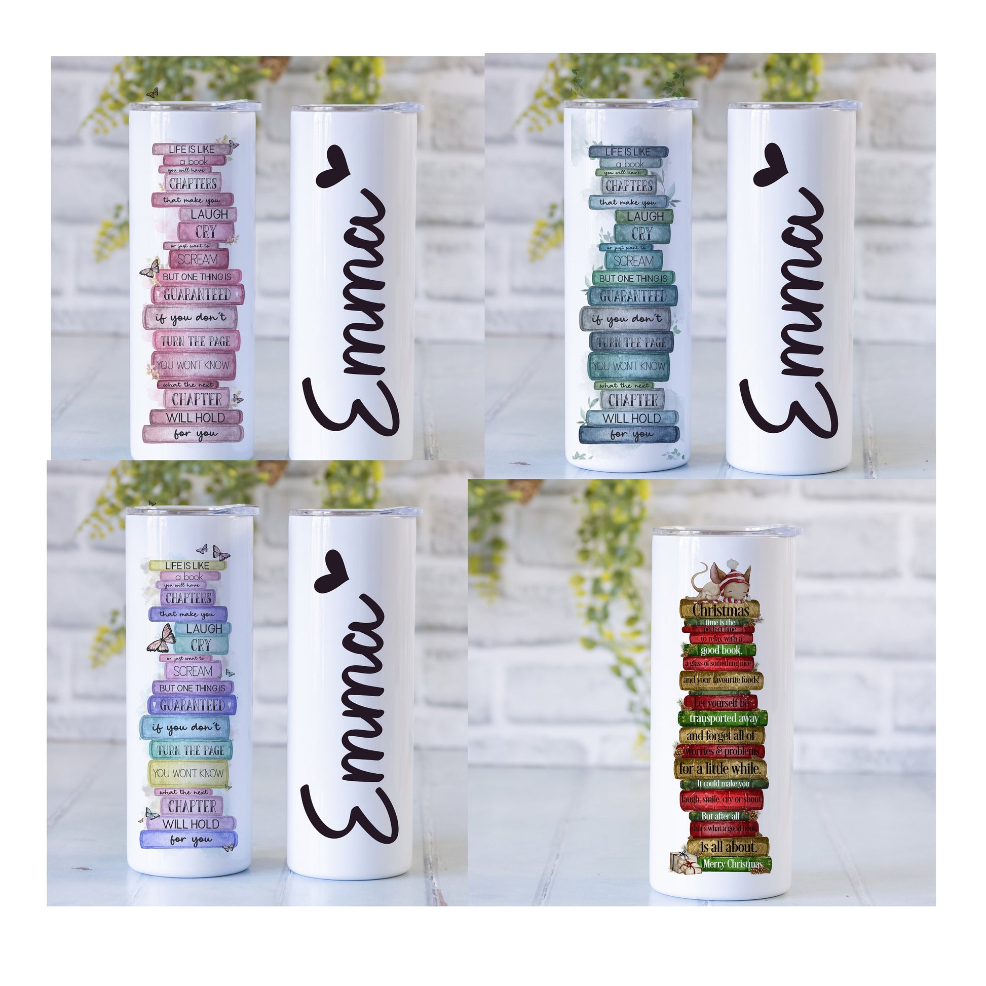 The lovely, personalised tumblers make lovely travel mugs. Printed with a watercolour book stack image, reading.......