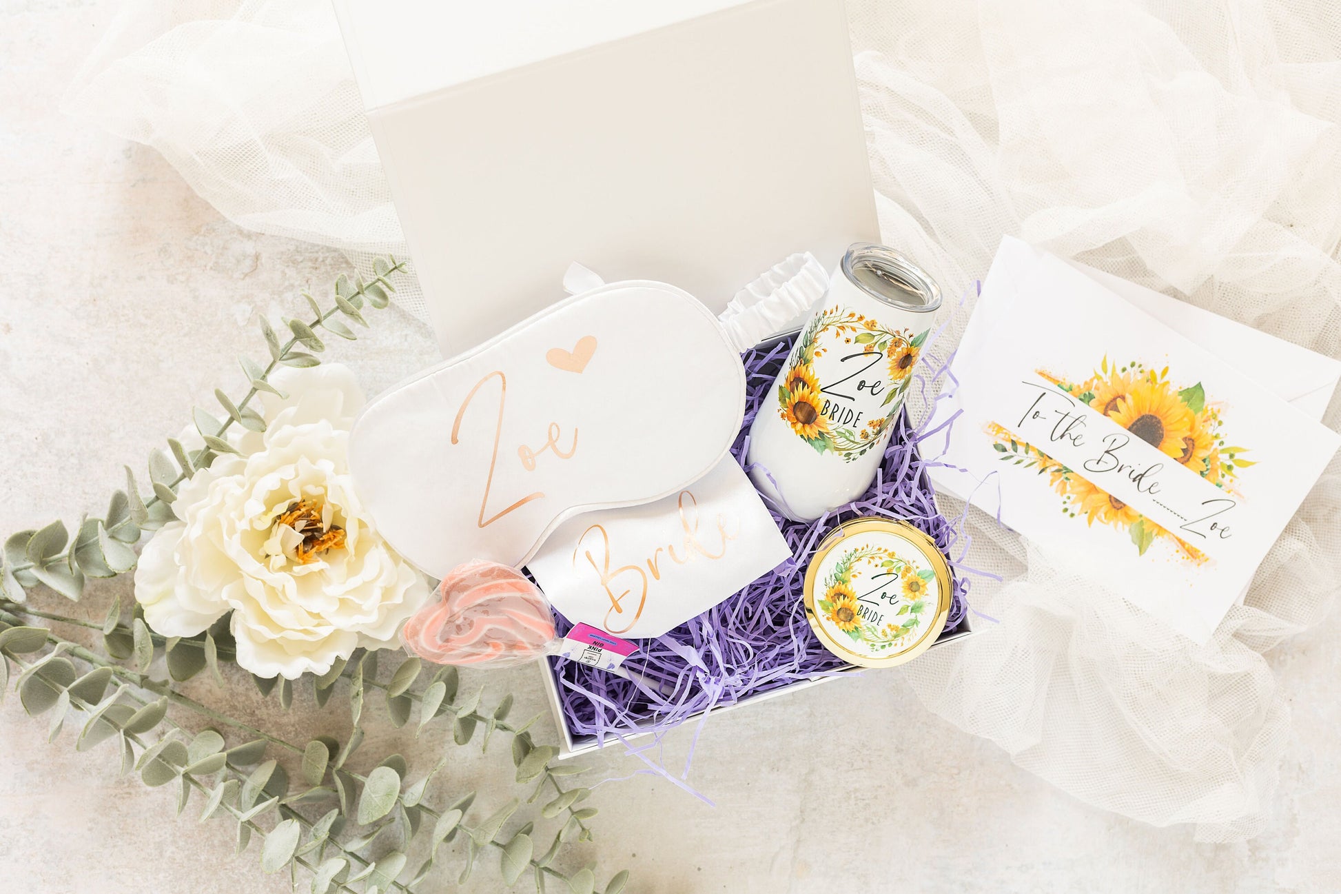 These personalised gift boxes are full of wonderful gifts. With a sunflower theme, they are perfect as gift boxes for Bridesmaids, Maids of Honour, Mothers of the Bride or Groom or for the Bride herself😊