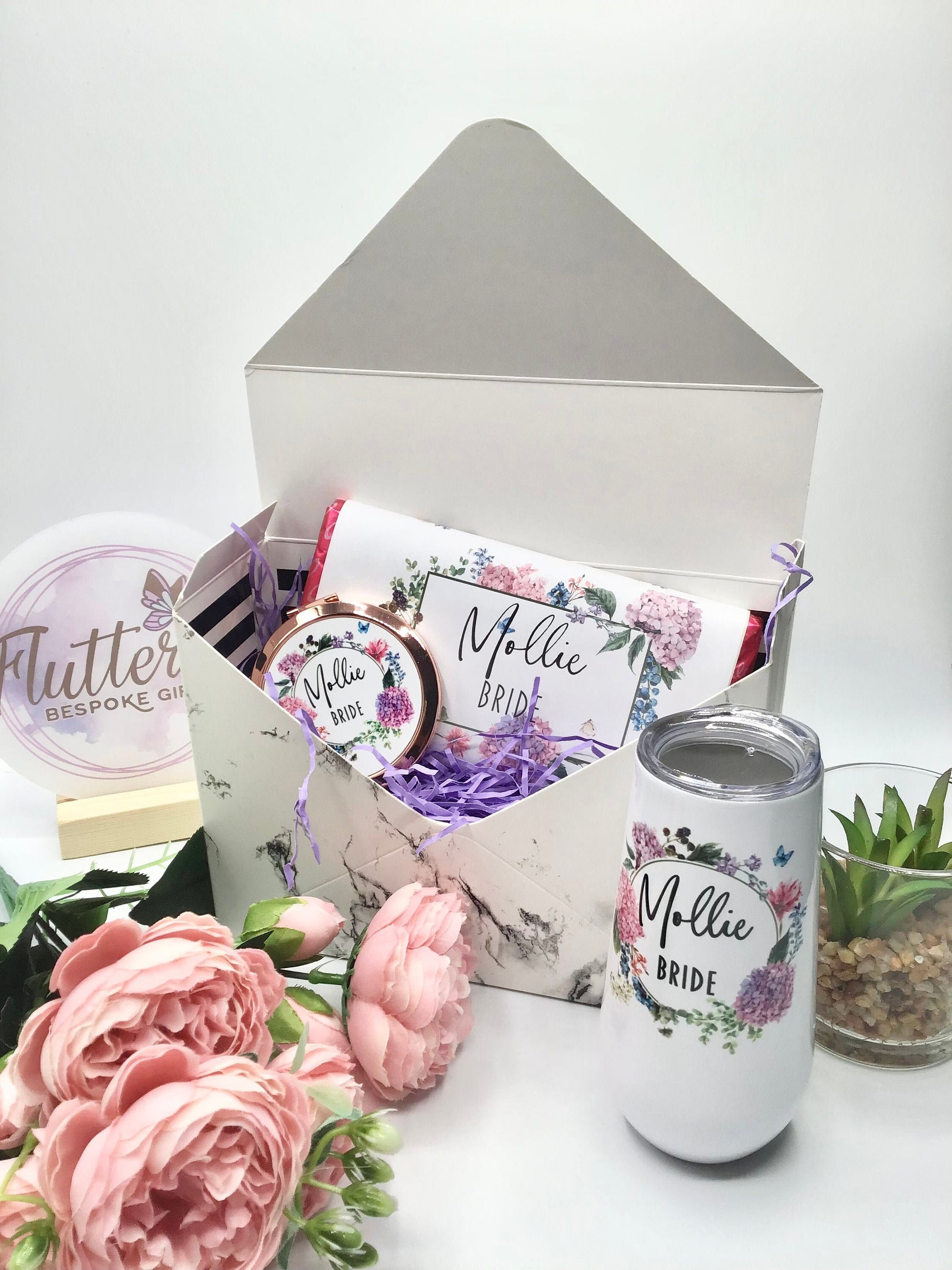 Each box contains a personalised, insulated, stainless steel champagne tumbler, personalised rose gold compact mirror, personalised chocolate bar all contained in a lovely, marble effect envelope gift box.