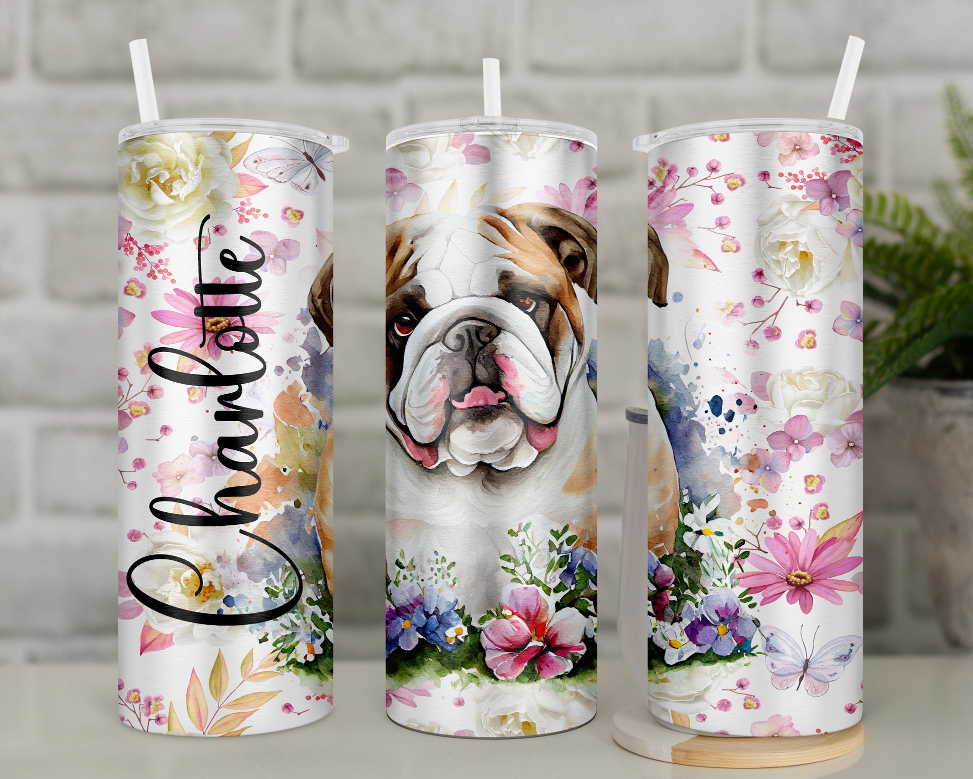 The perfect gift for any English Bull Dog lover! Printed with a beautiful, floral design with a cute Bulldog at the centre and personalised with a name.