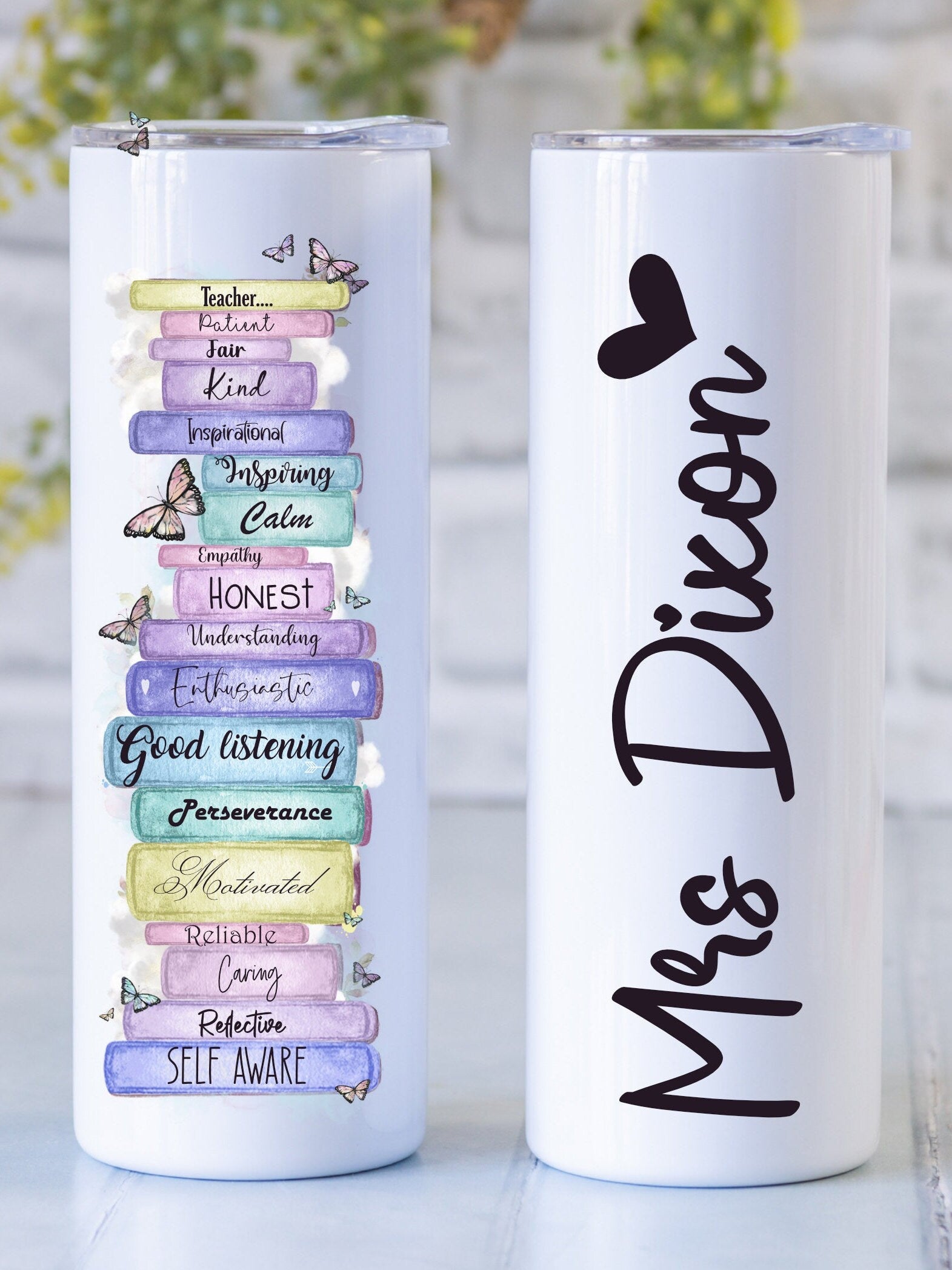 These lovely, personalised tumblers make lovely travel mugs. Printed with a watercolour book stack image, each book labelled with a characteristic of a good teacher......great for newly qualified teachers or as a thank you gift for a special teacher.