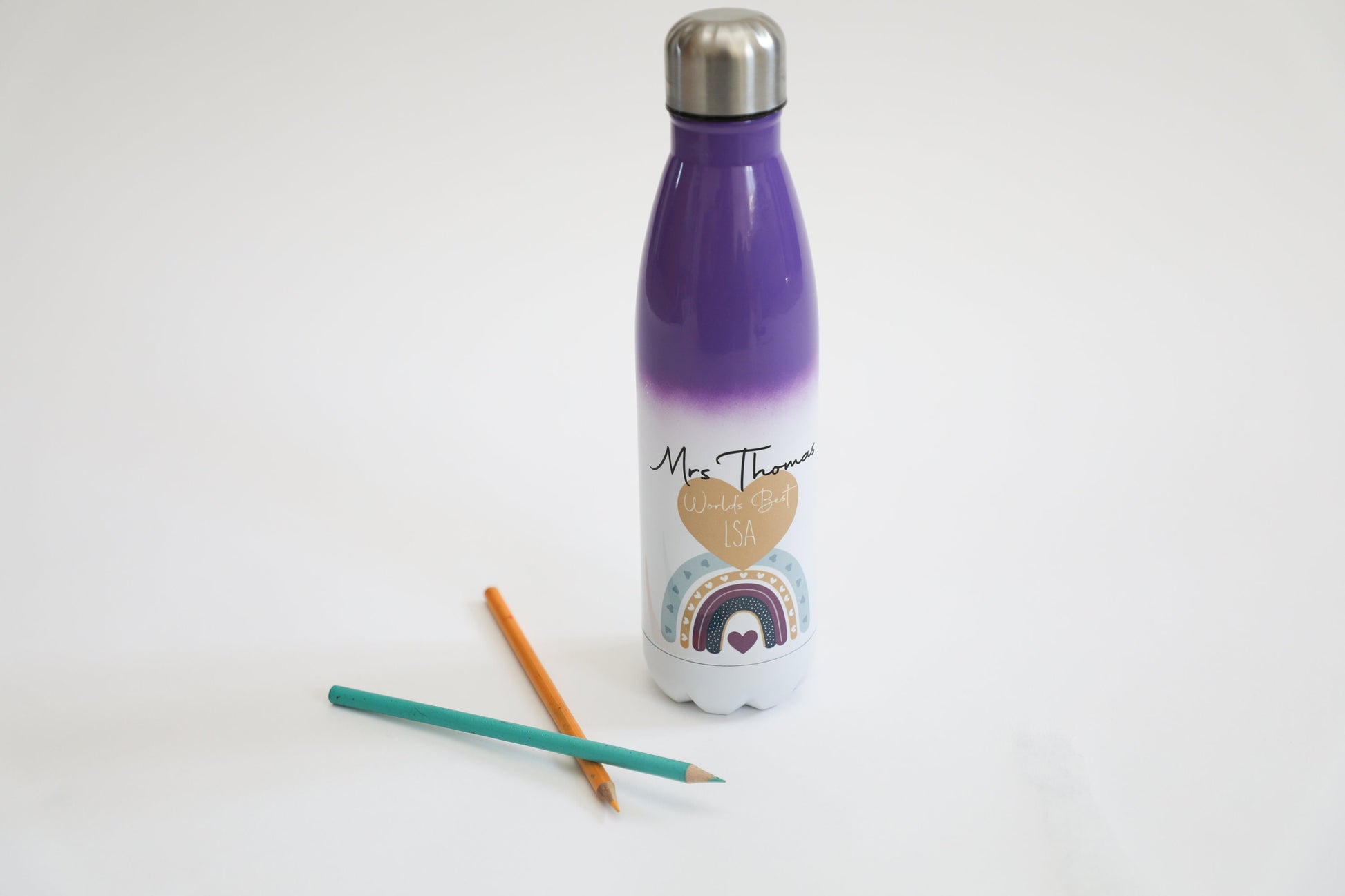 Beautiful personalised insulated best teacher drink bottles, printed with a rainbow design and personalised with a name.