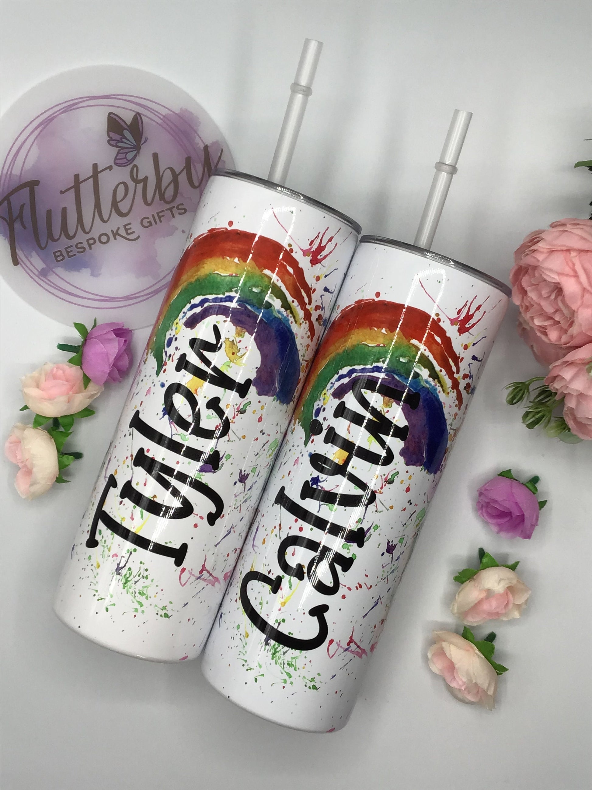 A tall skinny tumbler in white printed with a colourful splatter and rainbow design along with your name.