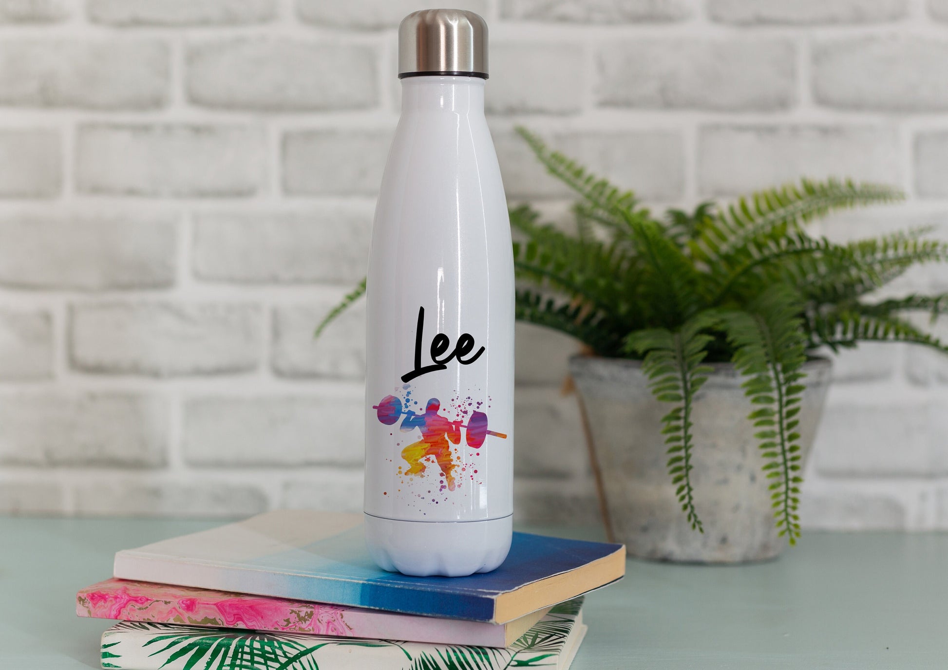 These insulated drink bottles are printed with a watercolour, paint splash male weight lifter design and can be personalised with a name and/or your own wording.